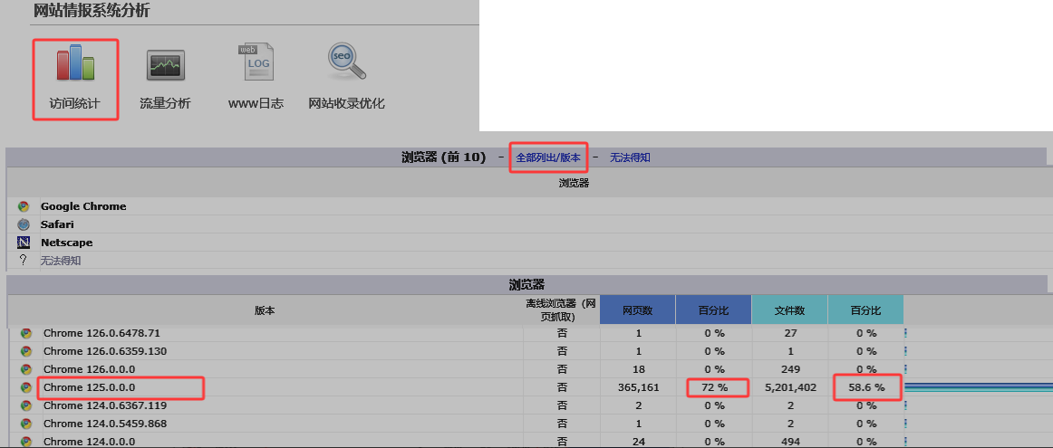 进入访问统计详细页面--找到“浏览器 (前 10) 点击:全部列出/版本 ”查看访问占比较大的客户端(User_Agent)浏览器版本。